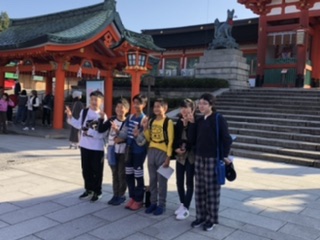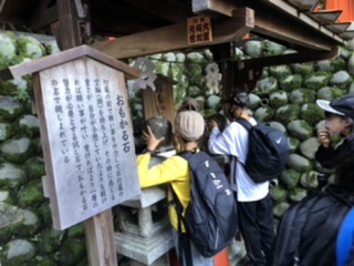 六年生たちは、たき川旅館にあいさつをして、別れを告げた後、今日最初の目的地、伏見稲荷神社に参拝しました。千本鳥居で有名な神社です。本殿を抜けて最初の千本鳥居を通って、奥社参拝所まで行きました。そこでおもかる石を持ち上げる体験をしました。