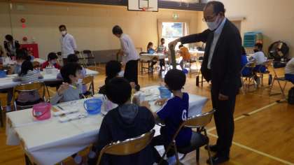 午前中、本校の体育館で、小渡風鈴を作りました。小渡商店街で風鈴を作りを教えているさかやさんに講師としてお越しいただき、風鈴を作りました。そして、一人一人自分オリジナルの絵を風鈴に描きました。