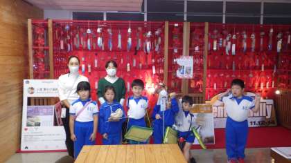 次に、旭観光協会に行きました。旭地区のために、たくさんの取組をしていることを教えていただきました。風鈴が飾られている前で、職員の方と記念写真を撮りました。