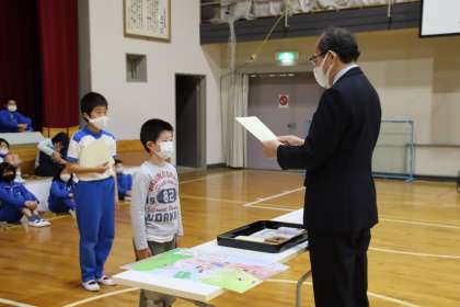 11月4日(金)の4時間目に、「旭地区林育推進事業」で今年度応募した推進ポスター・標語、夏休み中に行った科学研究作品で優秀な成績を修めた子の表彰を行いました。林育推進ポスターは旭交流館などにも掲示されています。