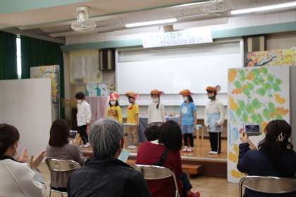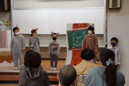 学芸会1 公開日 2022/11/09 更新日 2022/11/09 学校行事 11月5日(土)に学芸会を行いました。コロナ感染対策として、1年生と2年生、こども園は音楽室にて、3・4年生と5・6年生、全校竹楽器は、体育館で行いました。 1年生は「おとうとねずみチロ」、2年生は「ニャーゴ」の劇を行いました。子どもたちは、今までの練習の成果を発揮して、リハーサルの時よりもさらに大きな声で演技することができました。