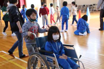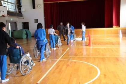 車いす体験では、ペアになって、乗る人と動かす人を交代で行いました。実際に動かしてみると、ちょっとした段差や道の狭さに気を付けなければいかないことなど、やってみないとわからないことがたくさんありました。子どもたちにとって、相手の立場になって考える良い機会となりました。