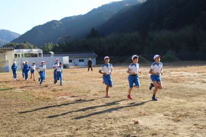 朝の活動の時間に、準備体操をした後、音楽に合わせてスタートします。1・2年生は6分、3年生から6年生は8分を自分の速さで走ります。グランドに色のしるしがついていて、毎日、どの色まで走ることができるか目標をもって走ることができています。本番も楽しみです。