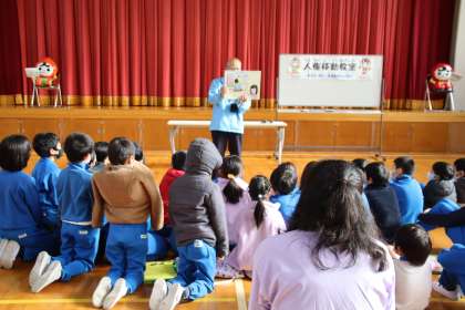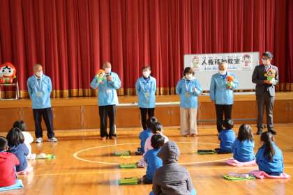 今年は、「やさしさについて考える」がテーマでした。初めに、人権擁護委員の方による手作り紙芝居の読み聞かせがありました。宿題を忘れた子が、宿題を見せてと頼むのですが、教えるのが優しさなのか、主人公の子が考えてしまうお話です。
