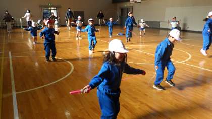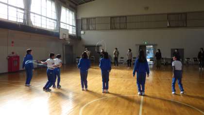 5・6年生では、「なわとびトラベラー」というのにチームで取り組みました。一人が短縄跳びを回して跳び、前に並んでいる人たちもリズムに合わせてジャンプしながら、一緒に跳んでいきます。全員が跳ぶと終わりです。5・6年生対親チームで行いました。最後は、5・6年生チームが勝ち、子どもたちはとても満足そうでした。このことを通して、みんなでなわとびを跳ぶ楽しさを教えていただきました。