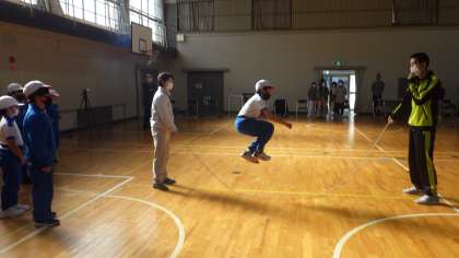 12月12日(月)に、1・2年生は2時間目、3・4年生は3時間目、5・6年生は4時間目に、日本なわとびアカデミー代表理事の粕谷将一さんに講師としてお越しいただき、親子なわとび教室を行いました。