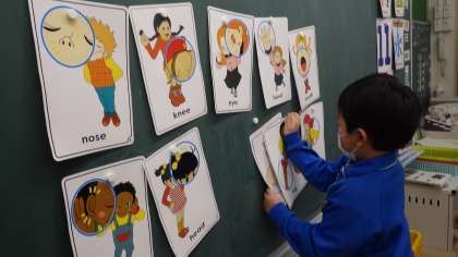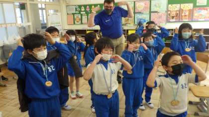1・2年外国語 公開日 2023/01/19 更新日 2023/01/19 各学年から 1月11日(水)の5時間目に、1・2年生が外国語の授業を行いました。 ALTの先生に教えていただきながら、「あたま・かた・ひざ ポン」の歌を歌いながら、踊りました。その後、替え歌にしながら、体をたくさん動かしながら、英語の単語を覚えました。