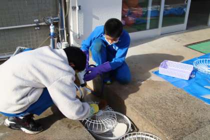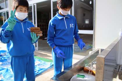 6年生が話し合って、自分たちが小渡小学校のためにできることとして考えたのは、学校の掃除をすることです。その中で、なかなか掃除の難しい扇風機の掃除をすることに決めました。そこで、特別教室の扇風機を外して、6年生みんなで洗いました。一つ一つ丁寧に水で洗いました。終わった後は、とても扇風機が見違えるようにきれいになりました。