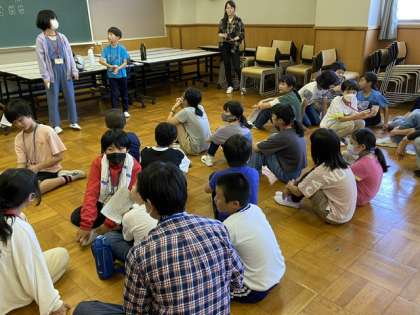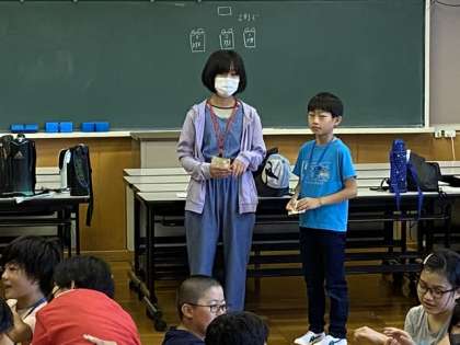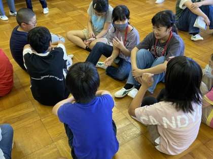 そして研修棟へ移動して、稲武小担当のレクリエーションを行っています。稲武小についてのクイズや林間学校についてのクイズ、豆知識クイズなどをグループごとに相談して楽しんでいます。