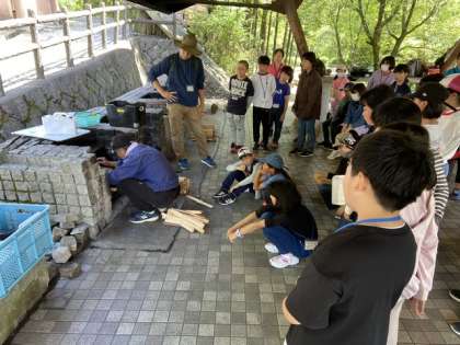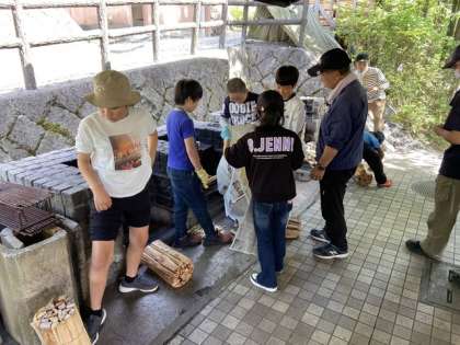 5年生は、野外炊飯場へ移動して、炊飯のやり方や火おこしの仕方などを係の人から教えていただきました。飯ごうのふたから水滴が垂れるので、それが出なくなってから、3分から5分後にご飯は炊き上がるそうです。どのグループも美味しいご飯を炊いてほしいです。