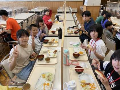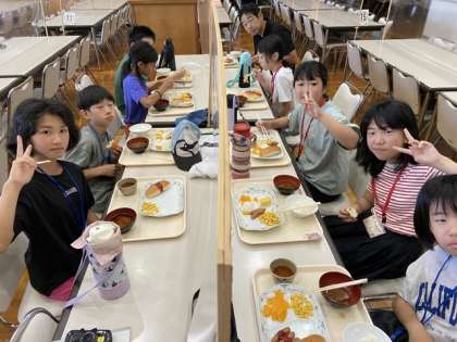 朝のつどいの後は、食堂で朝食バイキングをいただきました。ご飯もパンも両方あって、5年生は、自分の好きなものをたくさん取っていました。グループごとにいただきますをして、楽しく話しながらいただきました。一日たってすっかり仲良くなったようです。中には、何回もおかわりをする児童もいました。
