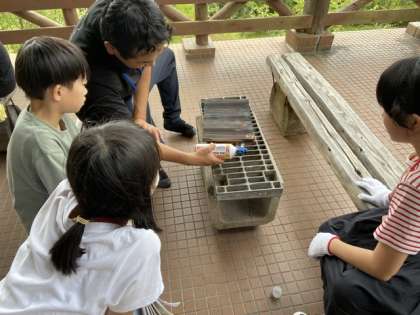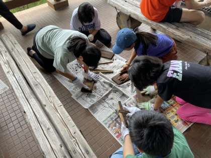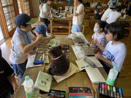 5年生は、昼食のお弁当を食べて、最後の活動焼き杉作りに取り組んでいます。杉の板をバーナーで焼き目をつけて、ヤスリと新聞紙で磨き、それをキャンパスにして絵を描いたり、文字を書いたりして、林間学校の記念品にするものです。事前に考えたデザインをもとに、みんな一生懸命に取り組んでいます。