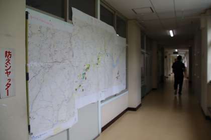 まず旭地区の大きな地図を組み合わせて、自分たちの住んでいる地域を確認し、その付近の避難所と危険な場所を確認して、書き込んだり、マークを張り付けたりして作り上げました。出来上がったマップは、校舎2階図工室の前に張り出されました。