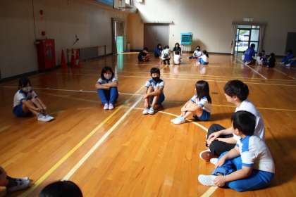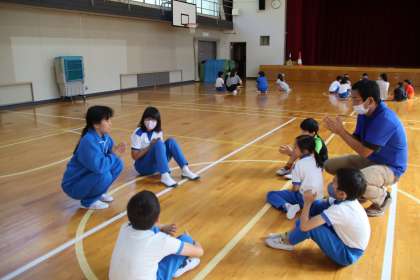 全校朝会では、子どもたちがファミリー班内で「夏休みの思い出」を発表し合いました。