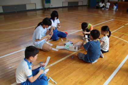 子どもたちは、ファミリー班に分かれた後、手順を説明していただき、道具を使って、紙トンボを作り始めました。はさみを使っての作業を何とか終えて、ひごのストローにテープで牛乳パックの羽を止めて出来上がりです。