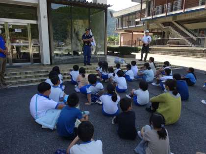休み時間に地震が発生し、多くの子どもたちが無事に避難できるか。また、矢作川が決壊した際に、避難場所まで整然と避難できるのかを、足助消防署旭出張所から3名の消防士の方にお越しいただき、チェックをしていただきました。