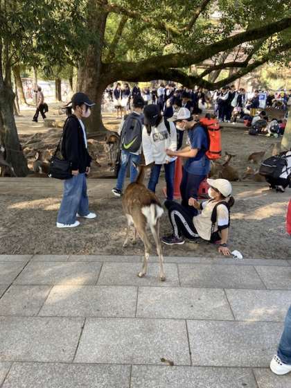 ガイドさんの説明を聞いて、大仏殿を見学した後、奈良公園の鹿にせんべいをあげました。楽しい時を過ごしました。