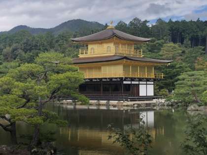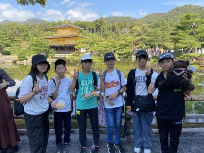 六年生は、二つ目の目的地、金閣寺に見学に来ました。入り口を入って道を右に曲がるとすぐに、金色の建物に目を奪われました。ガイドさんの説明を聞いて、写真を撮影したのですが、他の修学旅行生や外国人観光客ですごく賑わっていて、一瞬の隙をついて撮影しました。