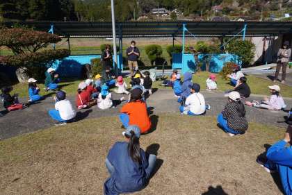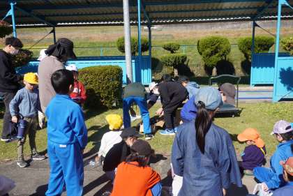 焼き芋パーティ 公開日 2023/11/10 更新日 2023/11/10 特別活動 11月8日(水)の3時間目に、毎年恒例の焼き芋パーティを行いました。先月収穫したサツマイモを、公務手の古畑さんに焼いていただきました。児童会でこども園の園児を誘って、一緒にいただきました。おいしそうに焼けた芋をみんなでほおばって食べました。こども園の子と一緒に楽しい時間を過ごすことができました。