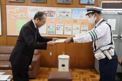 県警に表彰されました 公開日 2023/11/27 更新日 2023/11/27 校長室から 10月21日(火)に、長年にわたって小渡小学校が取り組んできた交通安全パレードの実績が愛知県警察に認められ、表彰をいただけると連絡があり、11月10日(金)に足助警察の方が、届けに来てくださいました。少なくとも50年は続いているパレードですので、この活動が認められたことは、本当にうれしく、そして誇らしくありました。今後とも、地域の交通安全の啓発に努められればと思います。