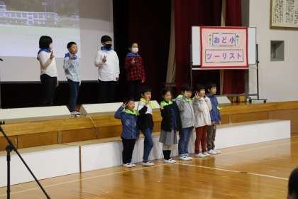 11月11日(土)、小渡こども園の園児たちと一緒に、学習発表会を行いました。今年度から学習発表会と名前を変えて、低学年、中学年、高学年がそれぞれ学習してきたことを、劇ではない方法で発表しました。各学年工夫された発表で、生活科や総合的な学習で取り組んできたことをわかりやすく、見に来ていた保護者や地域の方に伝えました。
