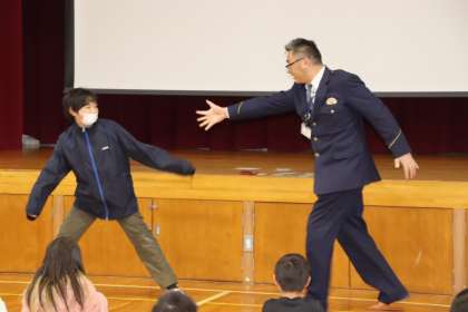 今回は、SNSの書き込みを見て、小学校へ乗り込んできた不審者が、教室へ押し入ろうとする設定でした。警察署の方に不審者になっていただき、職員がさすまたで侵入を防ぐ訓練をしました。一方児童は、緊急放送を聞いて手際よく鍵のかかる体育館へ全員避難することができました。その後、通学路など校外で不審者に声をかけられたときの対処法なども教えていただきました。