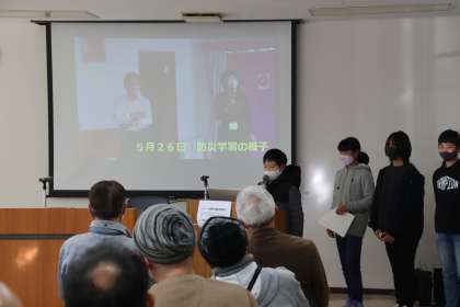 1月14日(日)、旭地区自主防災組織が設立されました。その会で、小渡小学校の5・6年生が防災について学習してきた内容を発表しました。これは、防災対策課が小渡小学校の5・6年生が防災について学習発表会で発表したことを聞き、発表を依頼をされたことから実現しました。日曜日にも関わらず、9人の5・6年生が集合し、地域のために発表を行いました。参加された方はみな、真剣にその発表を聞いてくださいました。