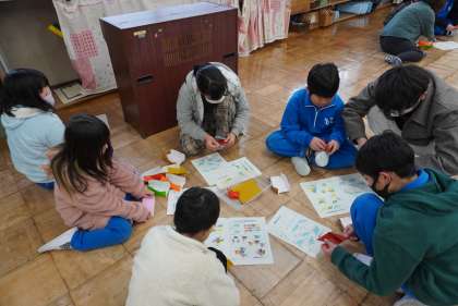 1月ものづくり教室 公開日 2024/03/06 更新日 2024/03/06 学校の特色ある活動 今年度STEAM教育の一環として行っているものづくり教室。今回は、折り紙で多面体を作ることを目標に取り組みました。折り紙を何枚か組み合わせて、サイコロ(正六面体)を作ったり、もっと面の多い形を作ったりしました。子どもたちは、思ったよりも集中して真剣に取り組みました。その後も、しばらく折り紙作りを教室で楽しんでいる姿が見られました。