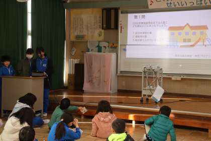 2月9日(金)、朝の活動で5・6年生が1〜4年生に防災について学習してきたことを伝えました。2000年に東海豪雨によって被災した経験を、下の学年に伝えていこうという思いから実施しました。1〜4年生が楽しめるように、クイズも行いました。今後も被災した経験を忘れずに、十分に備えていきたいです。