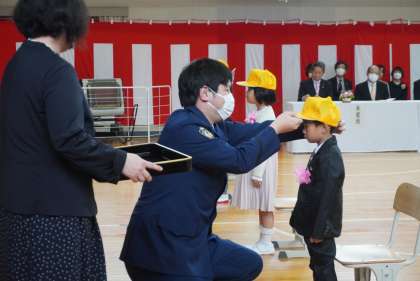 式の後半では、新入生に駐在さんから黄色の帽子が贈呈され、その後児童会長から小渡小学校の紹介がありました。