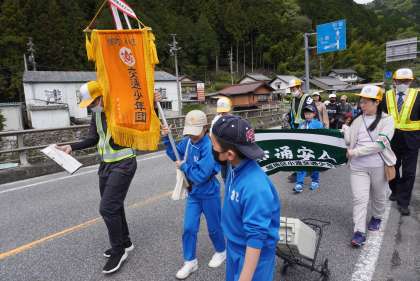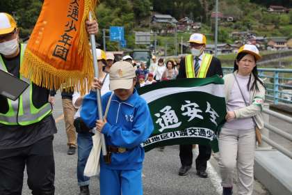 本校のPTAの代表やこども園の園児や先生、保護者、さらには安全のため駐在さんや足助警察の交通安全課の方にもお越しいただき、パレードを行うことができました。地域の方も大勢見に来てくださり、子どもたちは大きな声で、地域の方に交通安全の呼びかけを行うことができました。とてもよいパレードになりました。