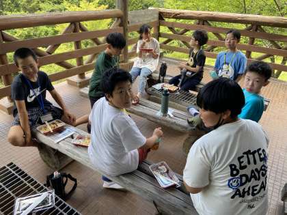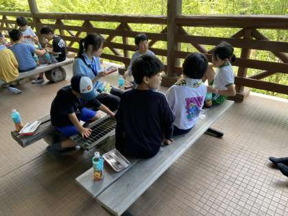 林間学校二日目の昼食中です 公開日 2024/07/10 更新日 2024/07/10 各学年から 体育館でのレクリエーションで汗を流した5年生は、創作棟に移動して、昼食のお弁当を食べています。すっかりみんな仲良くなって、楽しい話がそこかしこから聞こえてきます。この後は、クラフト製作です。杉の板を焼いて黒くしたところに絵を描きます。どんな作品ができるか楽しみです。
