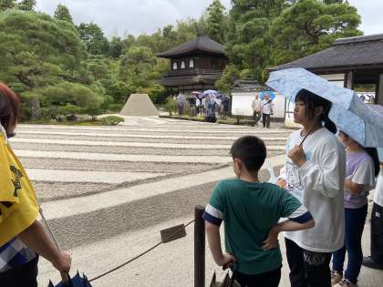 駐車場に着いた時は雨が少し激しくなり、心配されましたが、少し歩いたら雨もあがり、無事に見学ができました。金閣寺も銀閣寺も丘になっているので、6年生のみんなは、かなり歩き疲れた様子です。