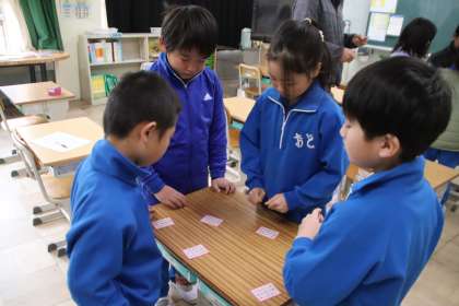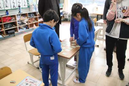1月20日(月)の朝の活動で、1・2年生はカルタ、3〜6年生は百人一首大会を行いました。それぞれ、グループに分かれ、読み手は教師が務めました。みんな真剣な表情で、楽しんで取り組むことができました。この取り組みも4年目を迎え、百人一首に取り組む3〜6年生の中には、上の句を読まれたら、取り札が取れる子も何人か出てきて、盛り上がっていました。この大会の優秀者には、表彰状が贈呈されます。