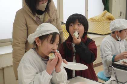 子どもたちは、この地域の幻のコメ「ミネアサヒ」を使ったご飯に、思い思いの具を入れて、おにぎりを握っていました。授業参観に来られた保護者の方も一緒に参加して、無事に食べることができました。