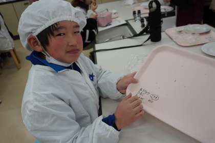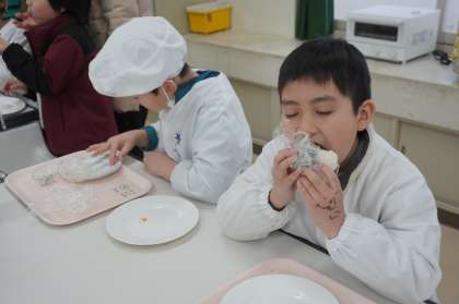 2月22日(土)の授業参観で、3・4年生はおにぎりづくりを行いました。これは、総合的な学習の一環として、日本の食文化調べと、交流しているフランスの学校テオフィル・ゴーティエ公立小学校に向けて、日本のファーストフードである「おにぎり」をアピールするためのものです。