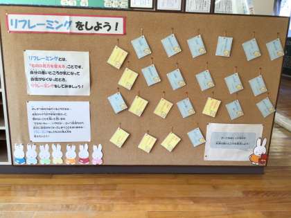 本校の児童玄関には、養護教諭の先生が作成してくれたリフレーミングカードがあります。