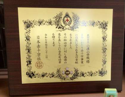 日本赤十字社より、金色有功章をいただきました 公開日 2025/04/23 更新日 2025/04/23 校長室から 青少年赤十字活動に対する長年にわたる活動が認められて、日本赤十字社より、金色有功章をいただきました。来客用玄関に飾らせていただいています。お立ち寄りの際は、ご覧ください。