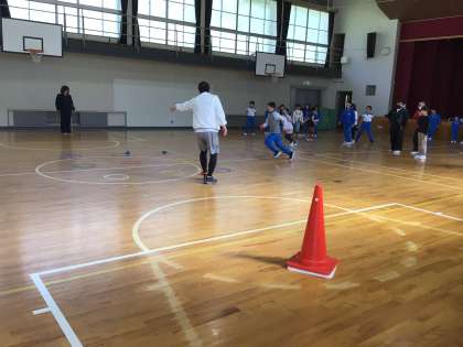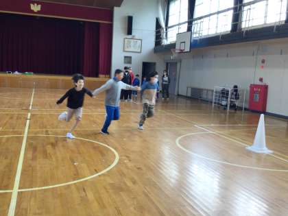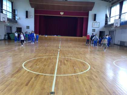 5月最初の全校集会を行いました。5・6年生の児童が企画してくれたゲームで、手をつなぎながら一緒にポール間を回ったり、ビンゴのようなマス目にポイントを置いて、早く3つを揃える遊びをしました・1年生から6年生までみんなで楽しく仲良く活動することができました。