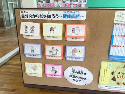 どんな検査があるのか、どんなことを行うのかをクイズ形式で養護教諭の先生が、掲示してくれています。昨年度の自分との差を比べたり、確認したりしながら、自分の体の健康について興味を持ってほしいと思います。