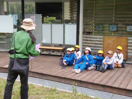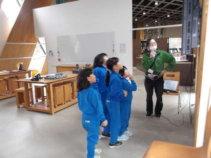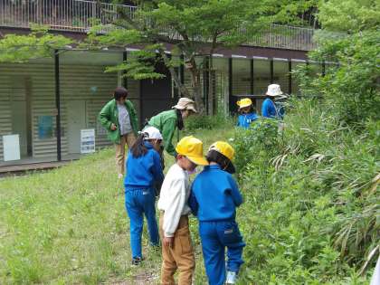 1・2年生の児童が自然観察の森の見学にいきました。会館の方に館内を紹介してもらい、いよいよ森の観察に…。バッタを探そうと一生懸命に観察をしていました。見つけたバッタを籠にいれて、しっかりと観察することができました。