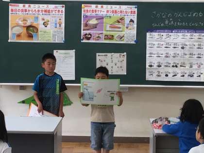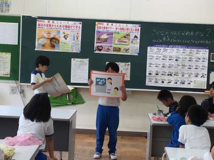 給食の時間の後に、ヘルシー委員会が睡眠についての紙芝居を発表してくれました。