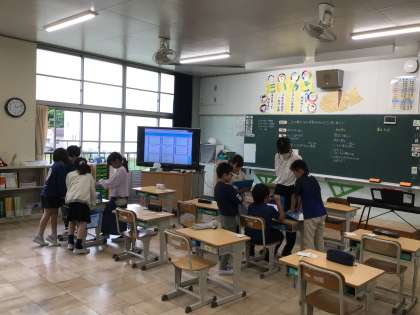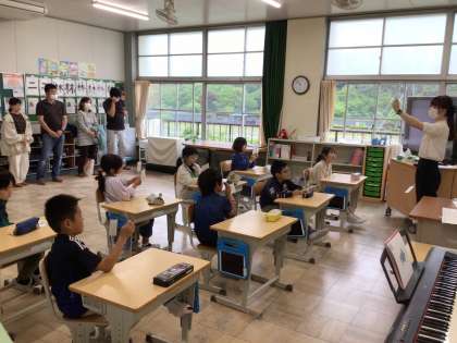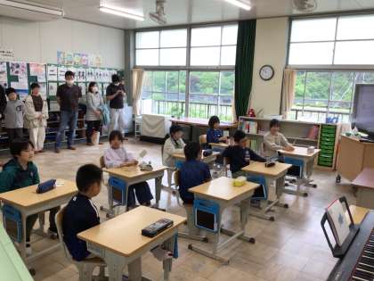 授業参観では、音楽の授業で「歌声のひびきを感じ取ろう」として、どんな歌声がしているのかをイラスト付きの表示を使いながら、あげたり、下げたり、揺らしたりして、表現することができました。