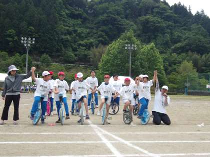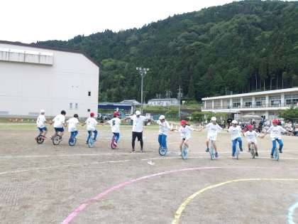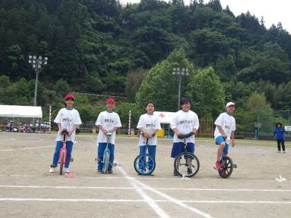 運動会のフィナーレは、5・6年生による一輪車の演技でした。短い期間の中で、精一杯技能を高めてきました。心をひとつに、みんなで頑張ることができました。