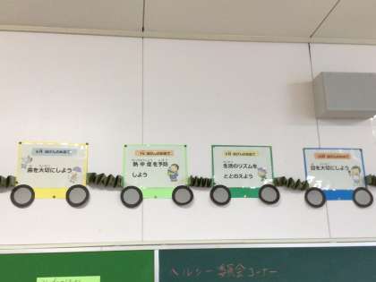 養護教諭の先生が、保健室の壁面に、可愛らしい掲示物を作成してくれています。