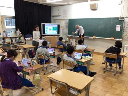 教育センターから、ICT支援員の方に来校していただき、3〜6年生でプログラミングの授業を行っていただきました。画面上のキャラクターをプログラミングで、思ったように動かしてみたり、そのための流れを考えたりすることができました。