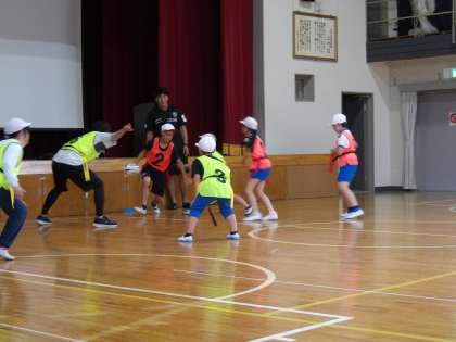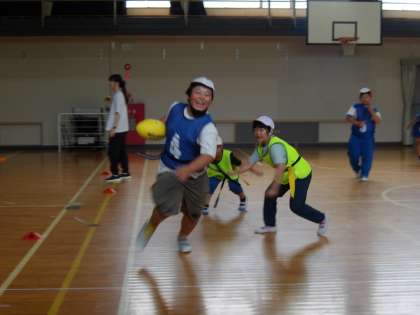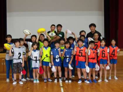 トヨタヴェルブリッツの選手の方に来ていただき、3〜6年生にタグラグビー教室を行っていただきました。運動会で行ったしっぽ取りのように、上級生に果敢に挑んでいったり、ボールをもって相手を交わそうとしたり、楽しく活動することができました。本当にありがとうございました。