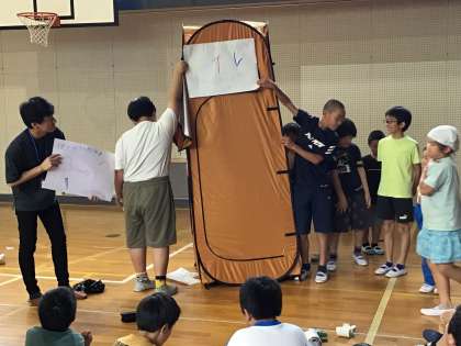 愛知工業大学の小池教授と学生の皆さんに来校していただき、防災学習会を行いました。今年は、避難所生活の中で欠かせない簡易トイレのことについて、設営を体験したり、実際の避難所生活を想像しながら、手作りで工夫できることがないかを考えたりしながら、学習しました。中に人がいることがわかる工夫をしたり、言葉が伝わらない人にもイラストで説明したり、さまざまな工夫をすることができました。