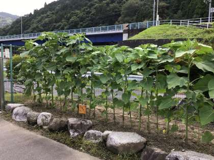 色とりどりの花々に蝶が止まっていたり、ツルレイシが覆い茂り緑のカーテンになっていたりします。また校門の近くには、種をいただいたひまわりが大きく育ってきました。