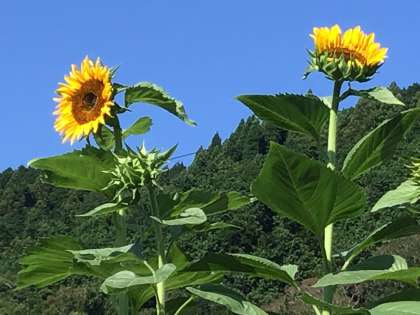 種をいただいて育てている校門横のひまわりが大きな黄色の花をつけました。背丈は2メートルを超え、3メートル近くまで育っています。ひまわりは太陽のある方向を向いて花をつけるといわれています。たくさんの光を浴びて、きれいな花を咲かせていってほしいと思います。